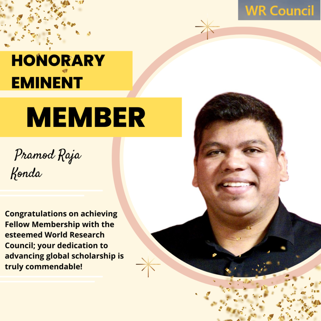 In recognition of his exceptional leadership and contributions, Pramod Raja Konda has been conferred with Honorary Eminent Membership by the World Research Council (WRC). This prestigious honor reflects his influence in shaping modern enterprise data strategies and advancing intelligent, responsible, and scalable data platforms.